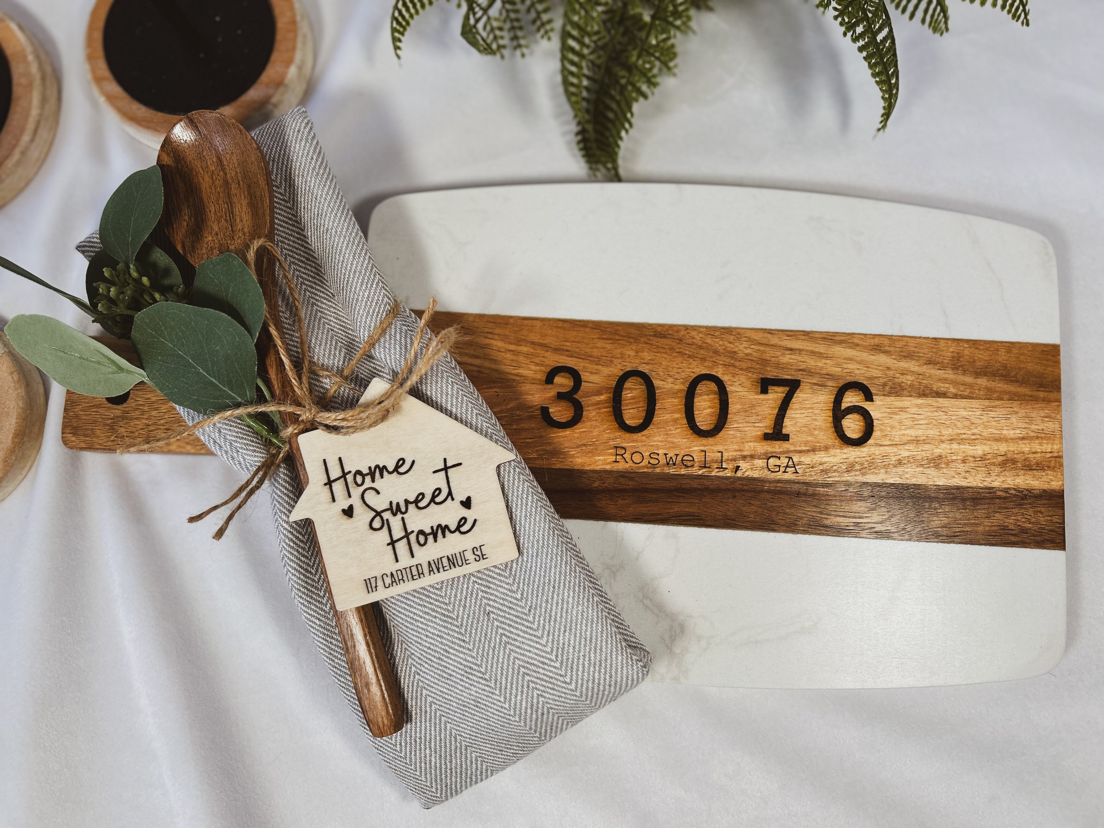 Custom New Home Gift - Marble and Wood Cutting Board and Coasters